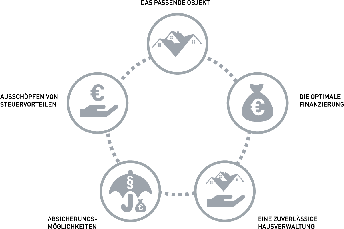 Dabei begleitet wir dich durch den gesamten Investitionsprozess. Von der maßgeschneiderten Anlageimmobilien, über den Notar und der Absicherung vor Mietnomaden bis zur zuverlässigen Hausverwaltung musst du dich um nichts kümmern. Unser Anspruch: dein Erfolg und dauerhafte Partnerschaft. Nutze die attraktiven Chancen des Immobilienmarktes für deine Zukunft und profitiere schon bald von ersten Mieteinnahmen, Wertsteigerungen oder Steuervorteilen.